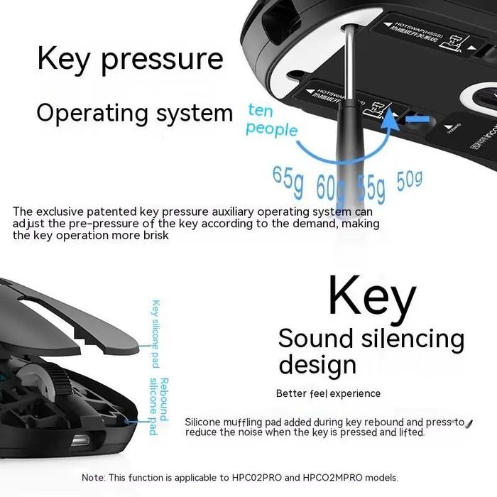 Users can customize their experience with the IRONCAT HPC02 Pro and Pro M mouse. The Pro models here support an adjustable key-pressure system allowing the users to easily adjust the pressure within a given range(for example 50g to 65g) based on the microswitches being used on the mouse.