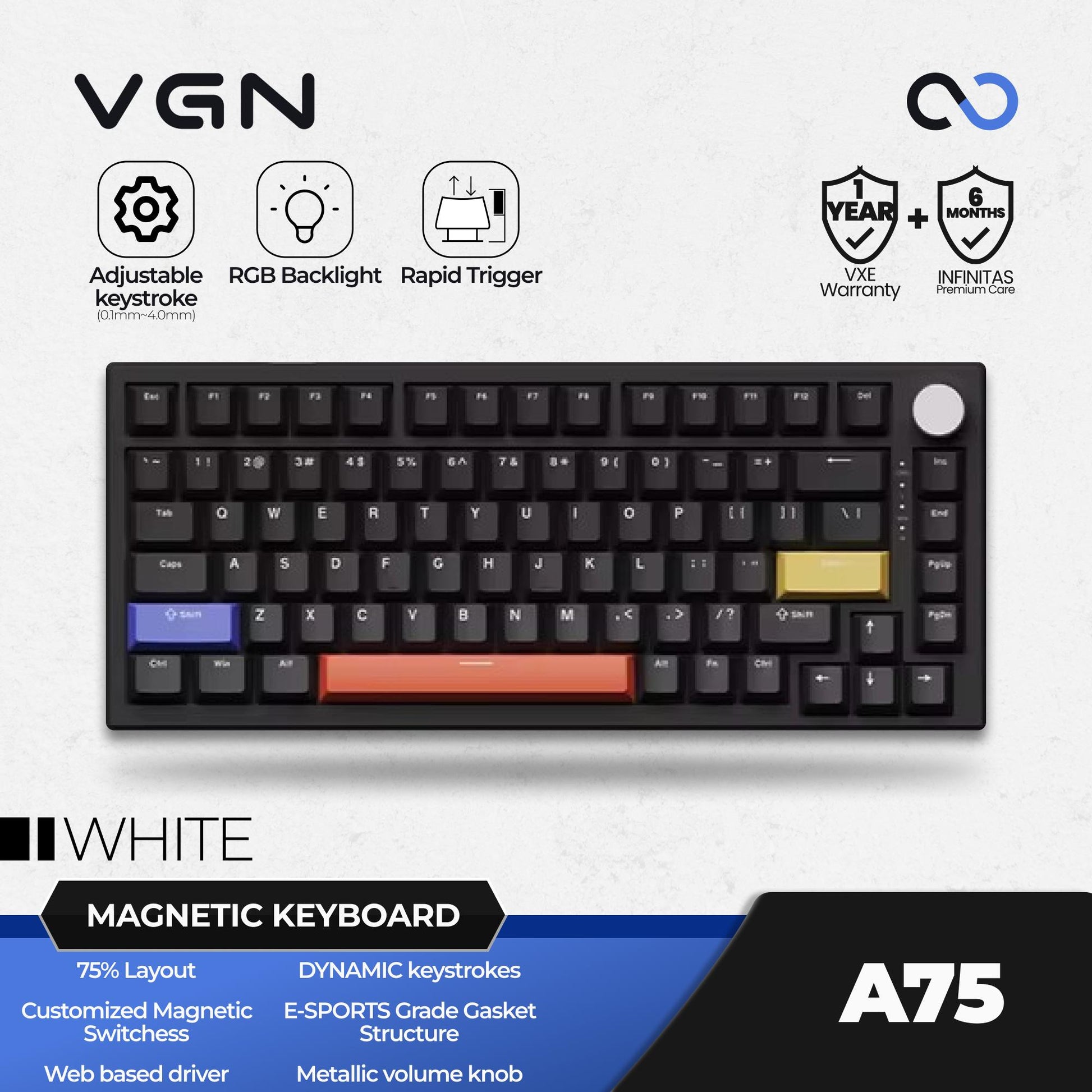 VGN A75 kini tersedia di Infinitas, adalah keyboard gaming baru dengan saklar magnetic yang dapat disesuaikan, memungkinkan respons pemicu lebih halus dan cepat. Keyboard ini memiliki struktur gasket mount grade esports dengan pengisian berlapis untuk umpan balik yang konsisten. Tombol volume metalik memudahkan pengaturan suara, sementara keycaps PBT berkualitas tinggi menambah pengalaman visual dengan RGB backlight. Dengan konektivitas wired low-latency dan dukungan untuk sistem ganda, keyboard ini juga dilengkapi dengan driver berbasis web untuk penyesuaian pengaturan yang lebih mudah.